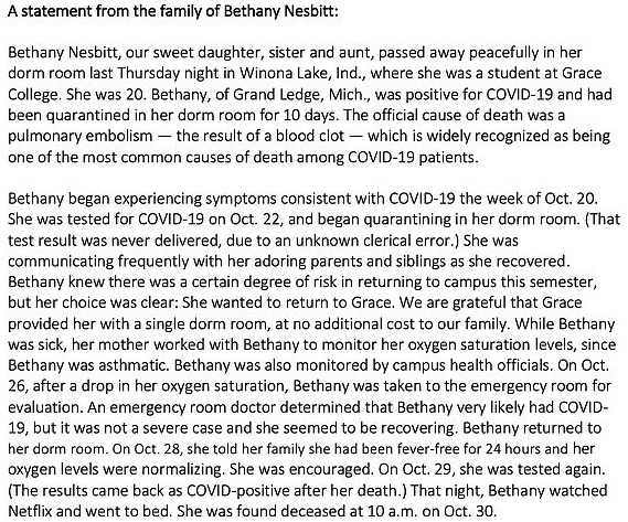 “We speak out not to spread fear, but to encourage others to exercise enormous caution as COVID-19 cases continue to rise,” the family stated. They have also launched a GoFundMe fundraiser in an attempt to raise $25,000 for a memorial scholarship in Bethany’s honor.