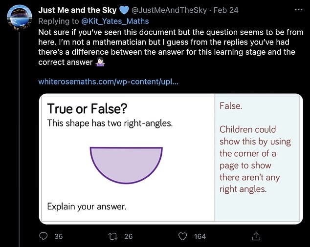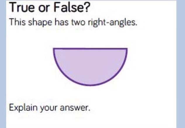 “False. Children could show this by using the corner of a page to show there aren’t any right angles,” the answer on the completed worksheet read.