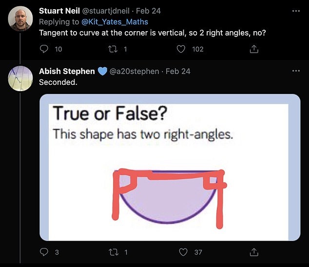 While some pointed out that the angles don’t appear to be right angles due to the curved line forming them, others suggested the correct answer is yes because the “tangent to the curve at the corner is vertical.”