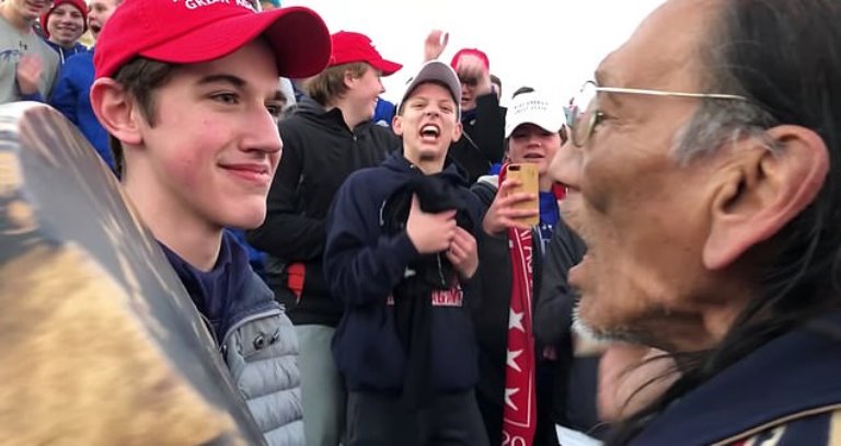 In the photo that has gone viral, Sandmann is seen standing in front of a Native American activist Nathan Philipps. The teen stares and smiles at him while Phillips plays his drum and sings.