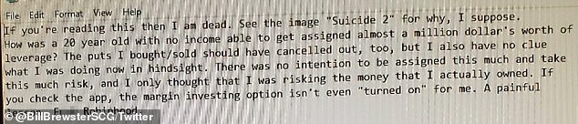 His heartbreaking suicide note was shared online by Bill Brewster, his cousin-in-law.