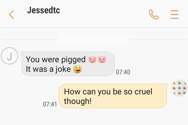 Not only did Jesse fail to show up at the airport when Sophie arrived, but he also further messed with her by sending her a rude message saying: “You were pigged. It was a joke.”