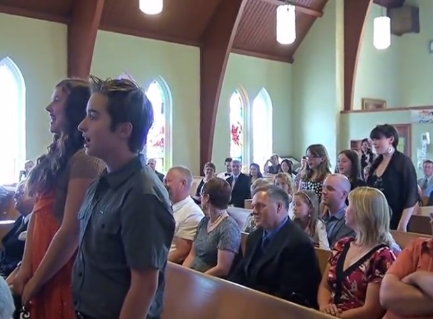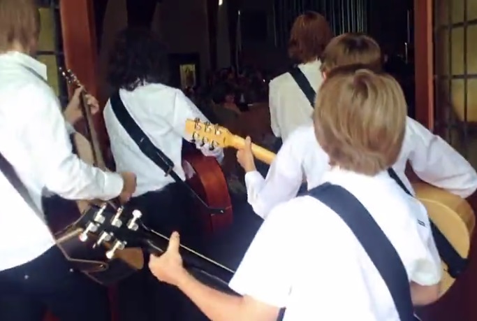 To spice up the flash mob, the students’ music teacher came in from the back of the church and led a group of young musicians who were playing on a guitar.