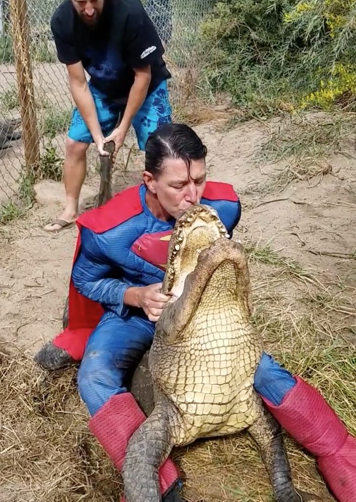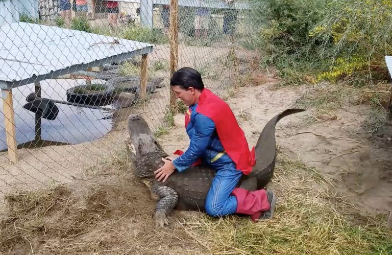 A man dressed as Superman raided an alligator’s nest to help the staff at Colorado Gator Farm to collect its eggs.