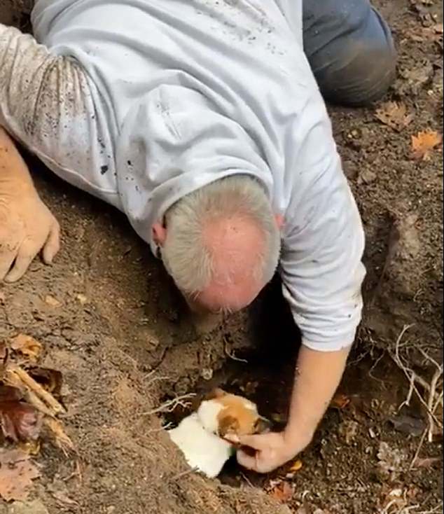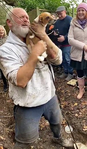 A tearful dog owner was caught on camera having a sweet reunion with his lost dog who went missing after it got trapped inside a foxhole.