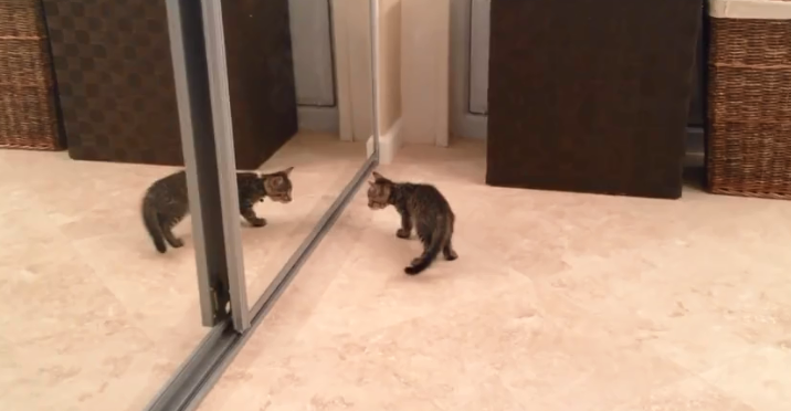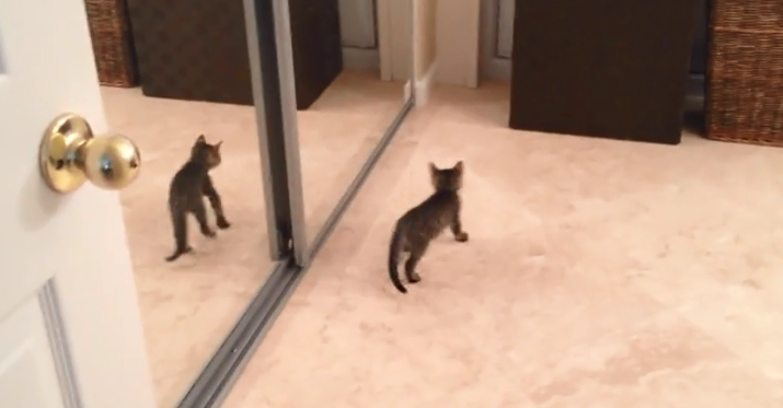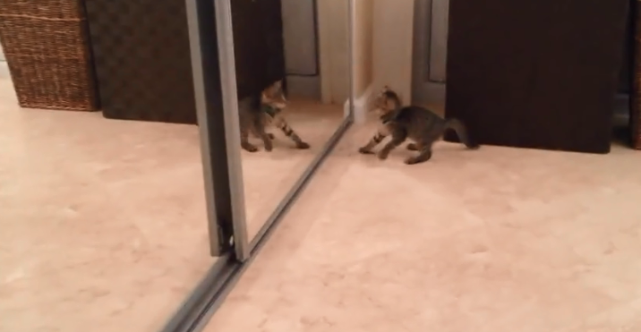 The cute tabby kitten went to attack the mirror aka his own reflection. The tabby kitten comes back defeated. However, the reflection stayed harmless.