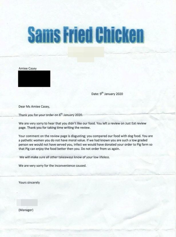 A 27-year-old mother received an abusive letter from a takeaway after she left a two-star review on its food ordering app.