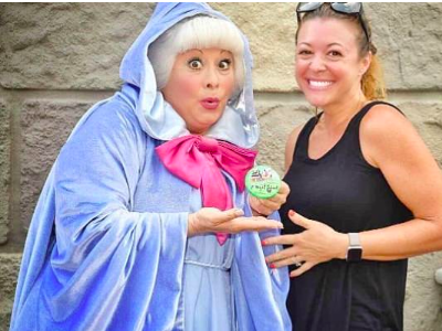 She met a lot of Disney characters who were extremely happy to hold the pin and pose for her. The best part of the trip was when she ran into the fairy godmother.