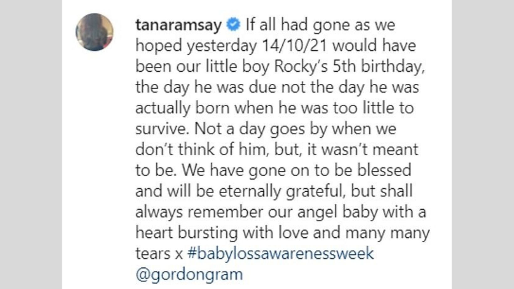 “Not a day goes by when we don’t think of him, but, it wasn’t meant to be,” she continued. “We have gone on to be blessed and will be eternally grateful, but shall always remember our angel baby with a heart bursting with love and many tears x #babylossawarenessweek @gordongram.”
