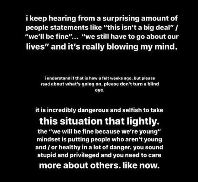 “It is incredibly dangerous and selfish to take this situation that lightly. the ‘we will be fine because we’re young’ mindset is putting people who aren’t young and / or healthy in a lot of danger. you sound stupid and privileged and you need to care more about others. like now.”