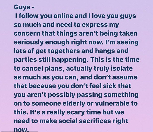 “I’m seeing lots of get-togethers and hangs and parties still happening. This is the time to cancel plans, actually, truly isolate as much as you can, and don’t assume that because you don’t feel sick that you aren’t possibly passing something on to someone elderly or vulnerable to this.”