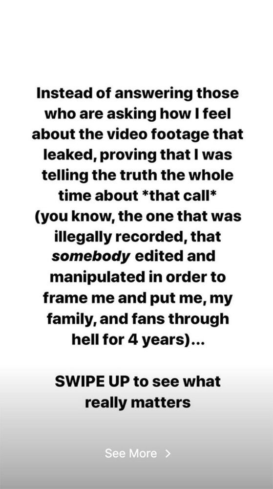 The 30-year-old singer wrote on her Instagram story: “Instead of answering those who are asking how I feel about the video footage that leaked, proving that I was telling the truth the whole time about *that call* (you know, the one that was illegally recorded, that somebody edited and manipulated in order to frame me and put me, my family and fans through h*ll for 4 years)…SWIPE UP to see what really matters.”