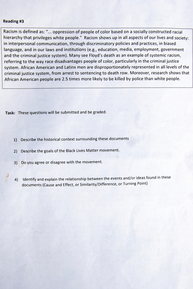 The student who shared the material said she felt uncomfortable in class because she thought the direction and discussion of the material was inherently biased. She added that she has been getting cyber-bullied by being labelled a racist for making public this material.