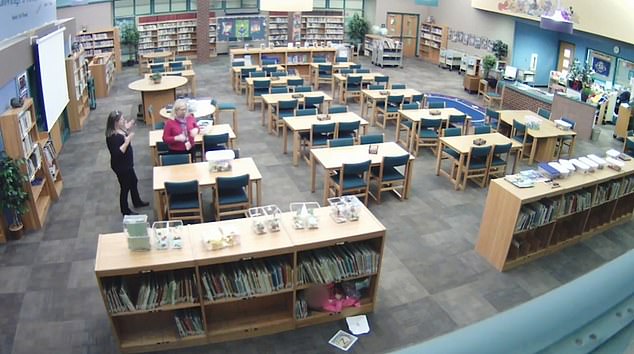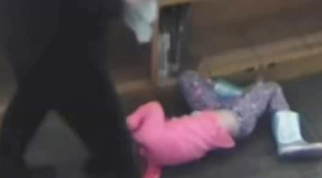 In disturbing footage, Crystal Smith, who worked at Bluejacket Flint elementary school, is seen pulling a little girl out of the bookshelf she hid in and kicking her.