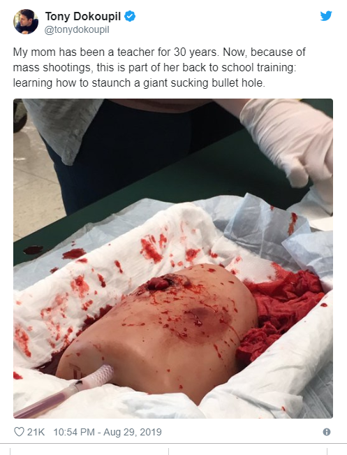 “My mom has been a teacher for 30 years. Now, because of mass shootings, this is part of her back to school training: learning how to staunch a giant sucking bullet hole,” he wrote.