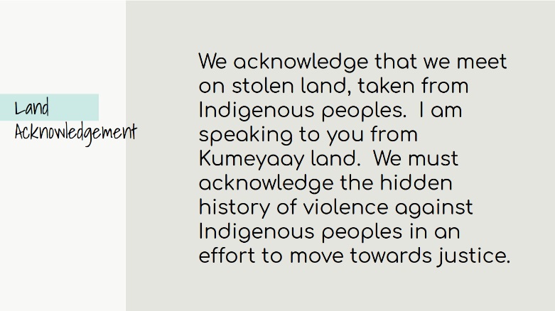 “We acknowledge that we meet on stolen land, taken from Indigenous peoples. I am speaking to you from Kumeyaay land. We must acknowledge the hidden history of violence against Indigenous peoples in an effort to move towards justice,” one of the controversial slides presented during the training reads.