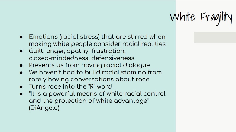Some of the suggestions include: “Confront and examine your white privilege,” “Acknowledge when you feel white fragility happening for you and slow down so you can listen, learn, and act,” and “teach others to see their privilege”