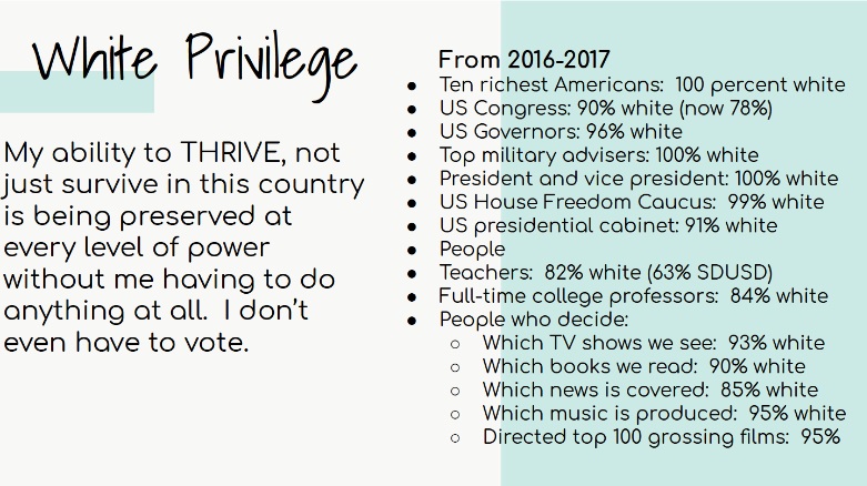 The presentation also suggests that white people get to decide “which books we read, which TV show we see, which news is covered, and which music is produced.”