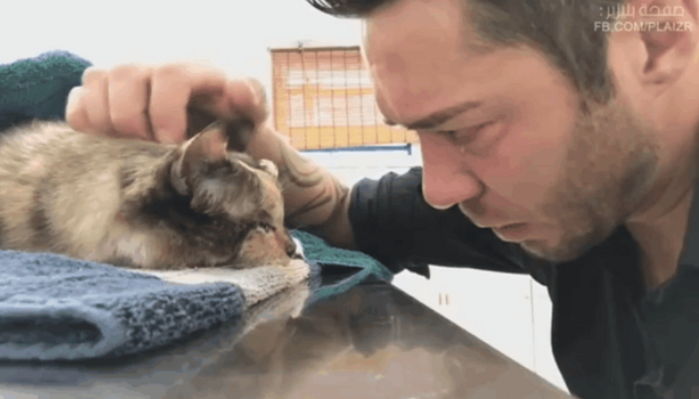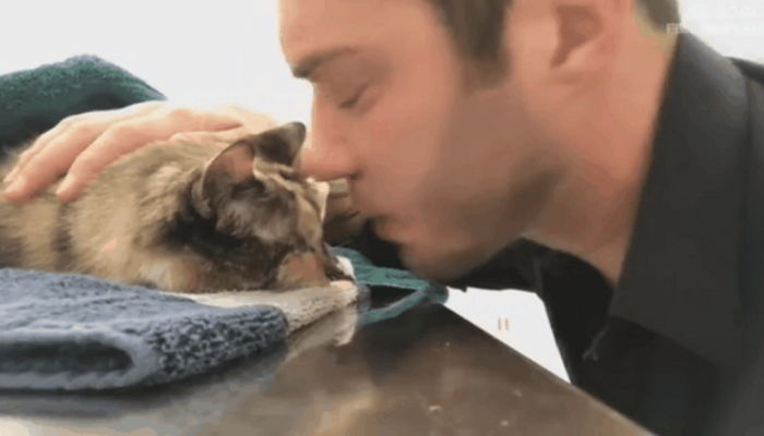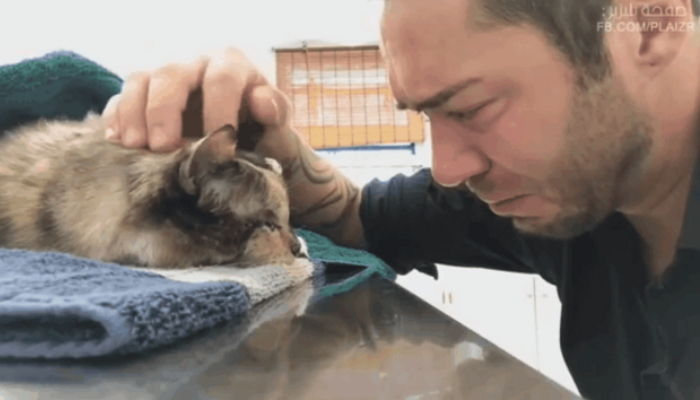 The owner, who strokes the cat’s head, immediately breaks down in tears.
