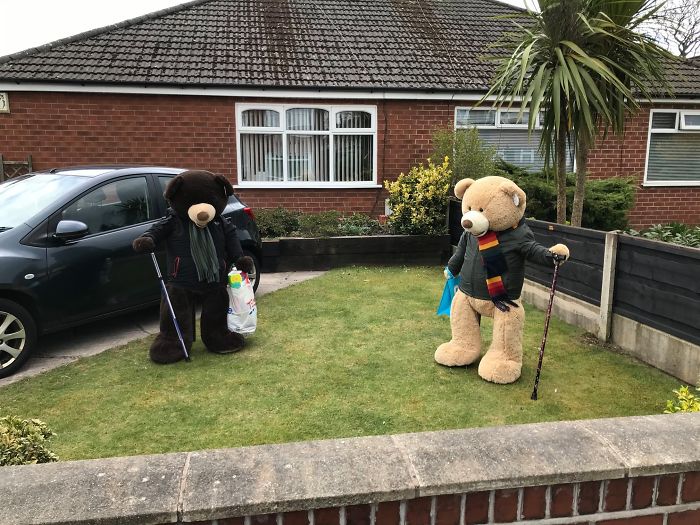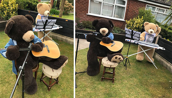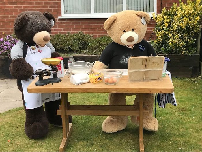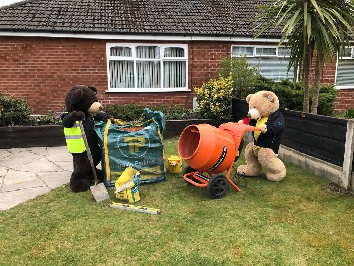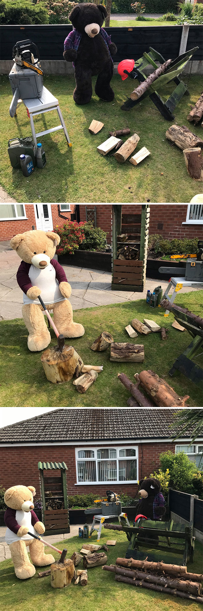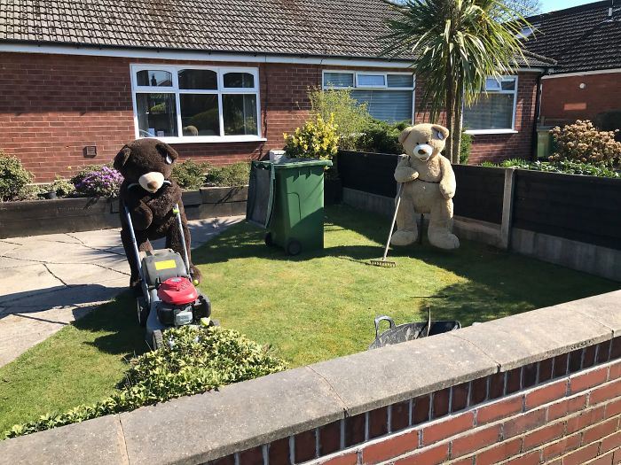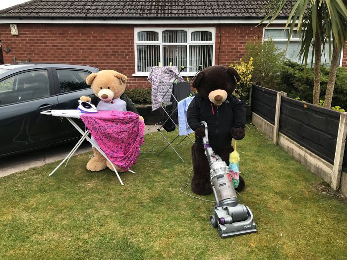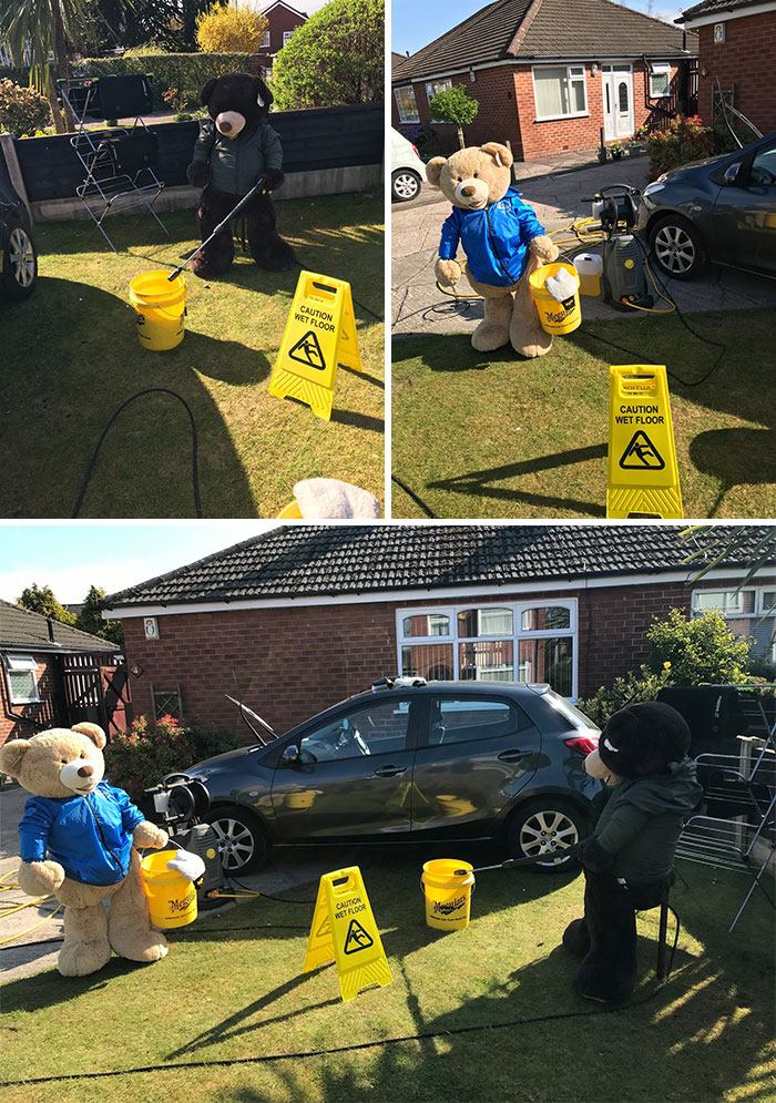 To motivate people to look at the brighter side, he has taken two giant teddy bears and is making them do the chores in his yard so that everyone can look at them and smile about it.