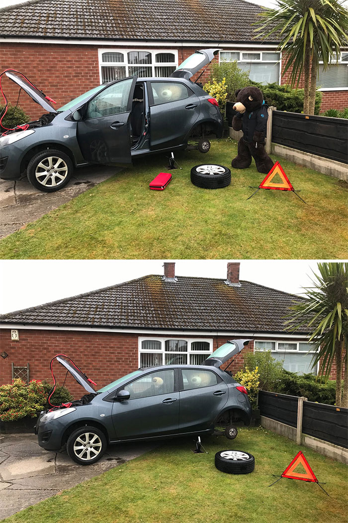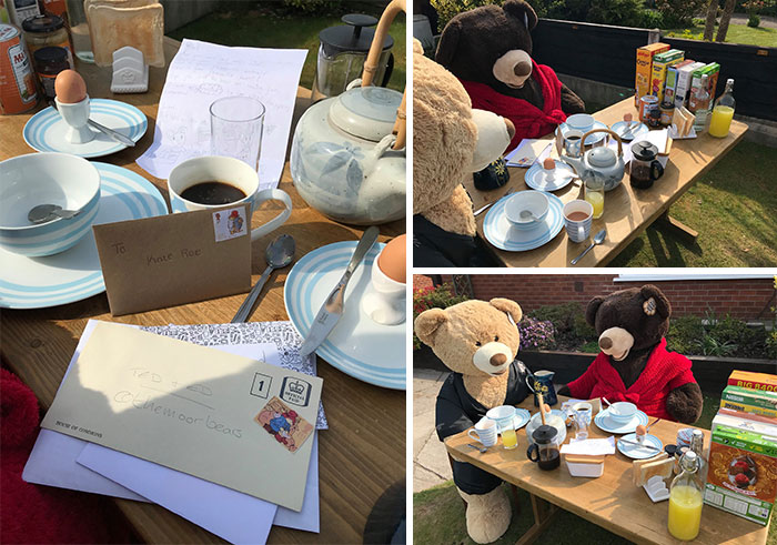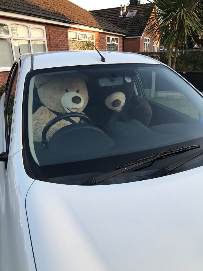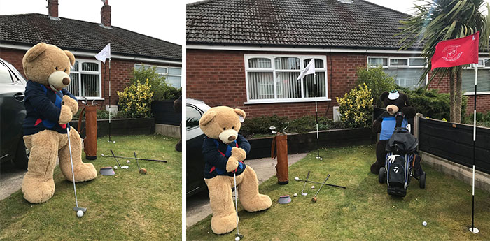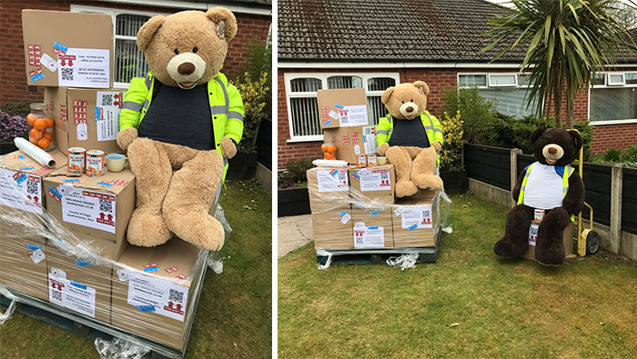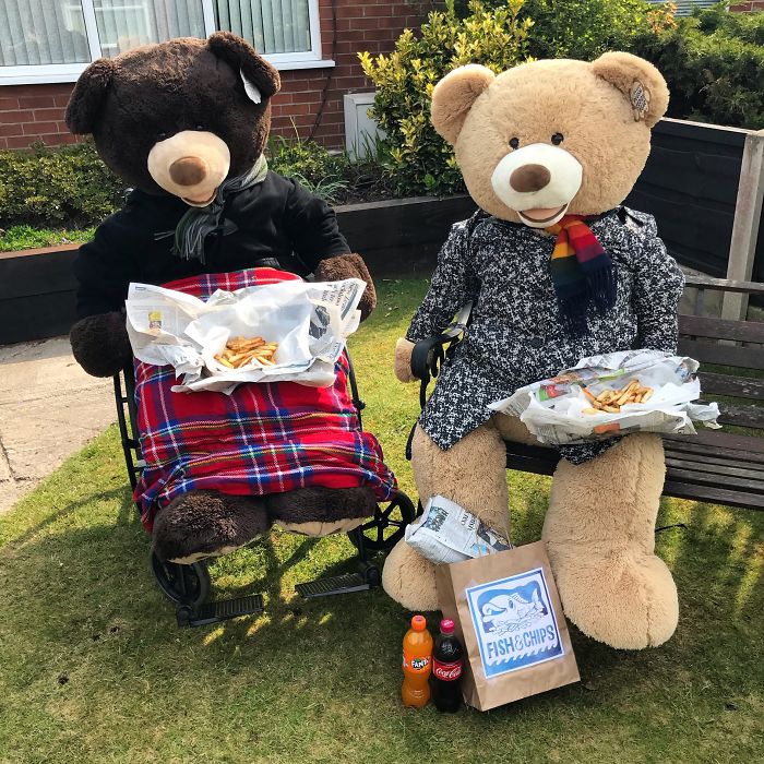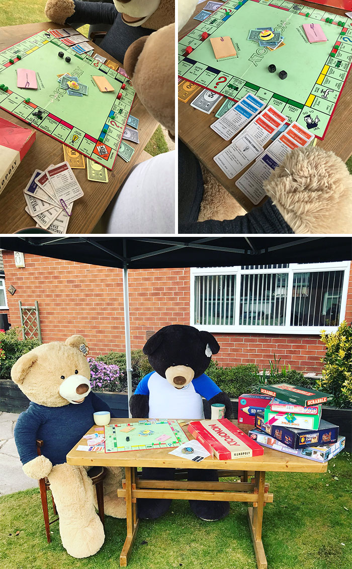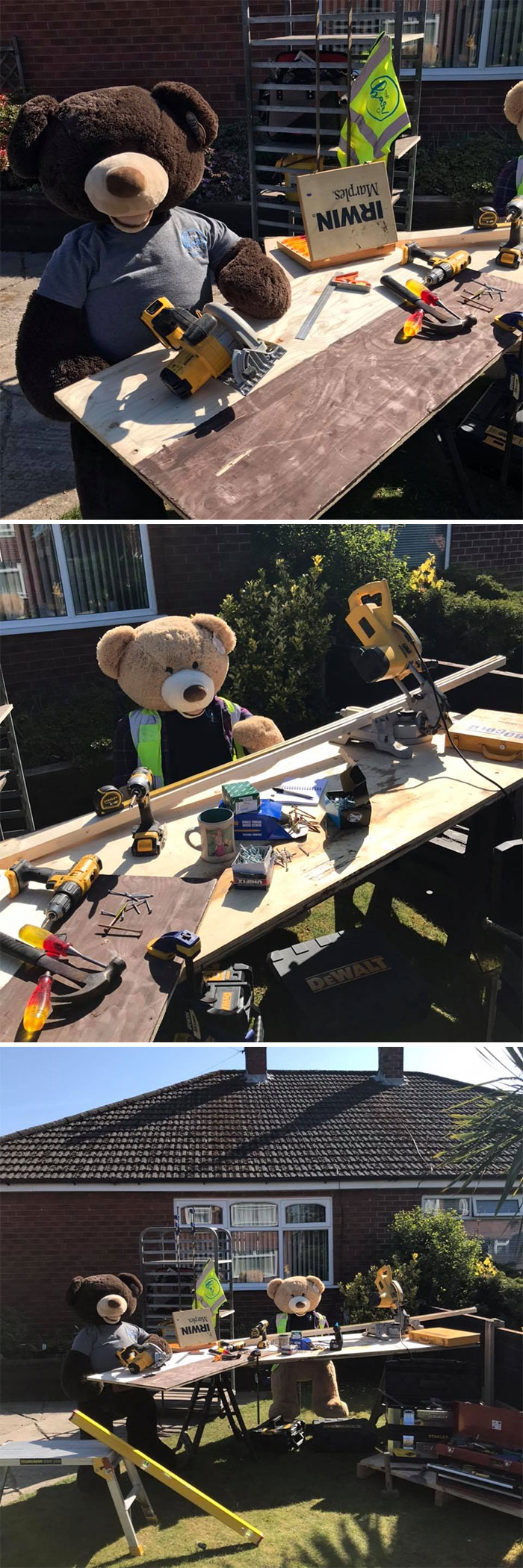 To motivate people to look at the brighter side, he has taken two giant teddy bears and is making them do the chores in his yard so that everyone can look at them and smile about it.