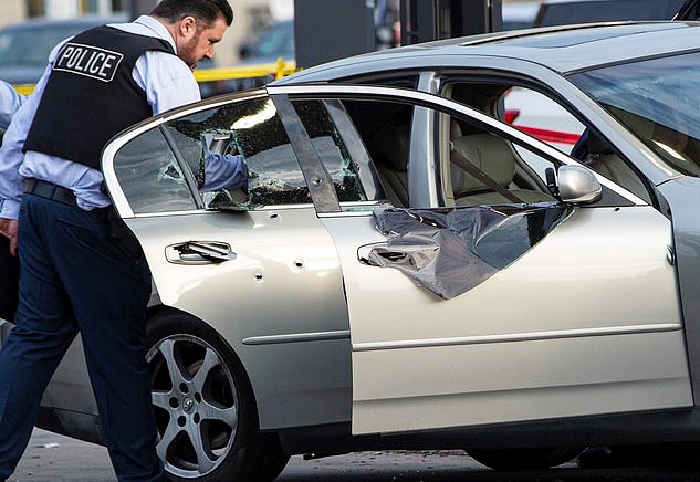 Photos from the scene show the vehicle sprayed with bullet holes.