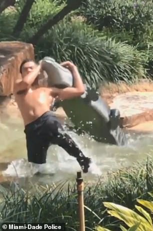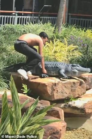 Gianny Sosa-Hernandez was arrested after he was caught on camera wrestling a life-size fake alligator on display at The Falls Shopping Center.