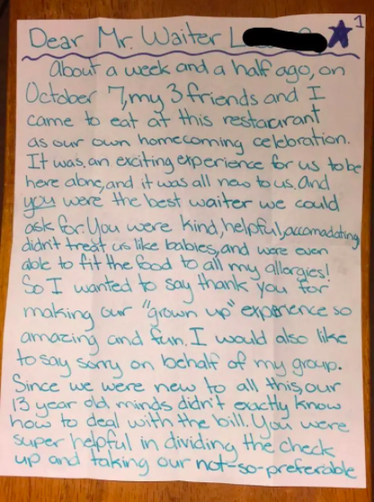 What the teenagers lacked in experience, they had a great sense of integrity and gratitude. After they heard about how much they should have paid the waiter, one of the children returned back to the restaurant nearly 10 days later with a handwritten letter in his hand.