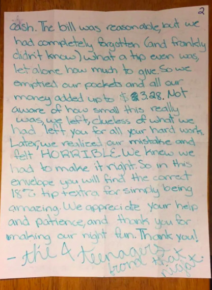 As you can read from the letter, the teens say that it was an awesome night for everyone and how important the waiter’s role in making the night special was. At the same time, they honestly state and acknowledge their inexperience with properly handling a bill.