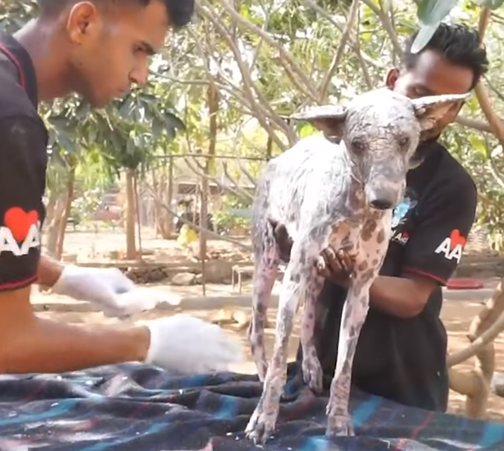 It is quite a sad scene to watch a dog with an extreme skin disease trembling over the pile of rocks, almost that he looks invisible.
