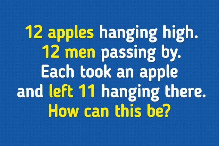 “12 apples hanging high. 12 men passing by. Each took an apple and left 11 hanging there. How can this be?”