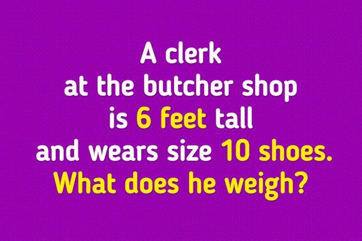 “A clerk at the butcher shop is 6 feet tall and wears size 10 shoes. What does he weigh?”