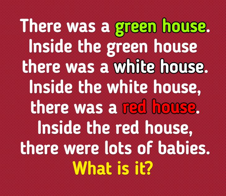 “There was a green house. Inside the green house there was a white house. Inside the white house, there was a red house. Inside the red house, there were lots of babies. What is it?”