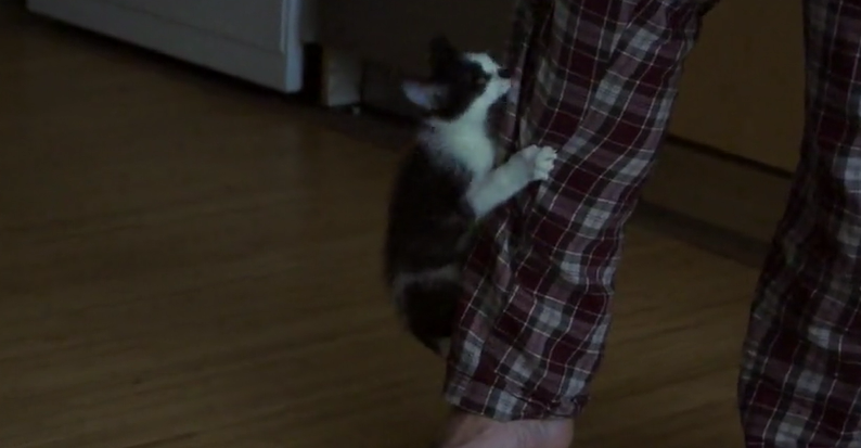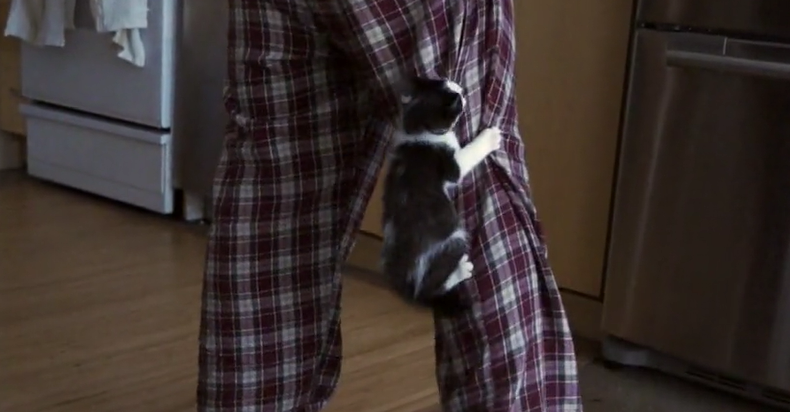 This is what happened here as well; the owner was doing household chores when the kitten decided he needs to play with him. The owner was in no mood to play, but kitten didn’t care and start to climb on the leg over the pajama pants.