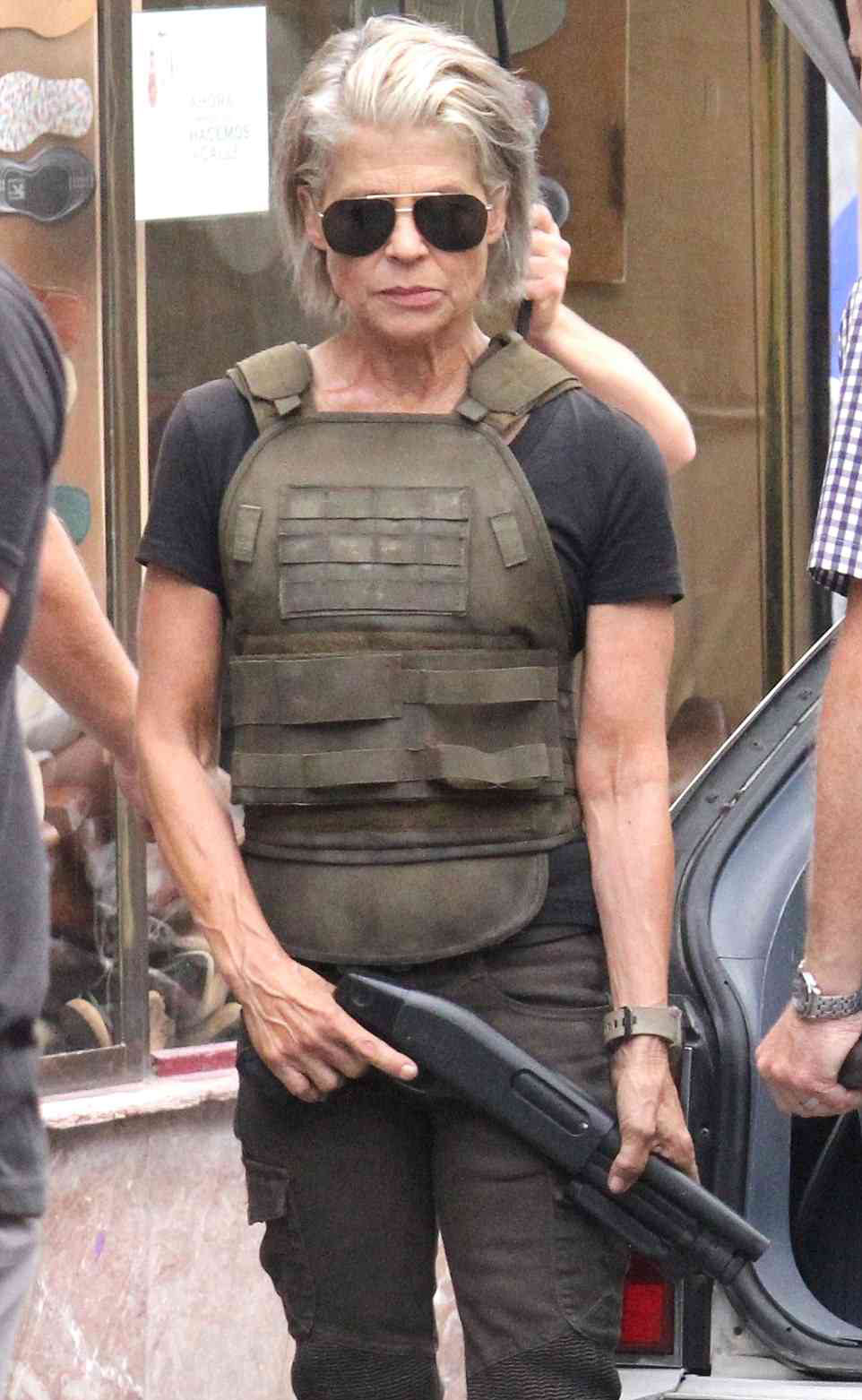 The 61-year-old actress Linda Hamilton looked as fit as she was in the first Terminator movie, the actress was seen for the first time in character as Sarah Connor for the Terminator reboot when she was spotted on set in Madrid, Spain on Tuesday.