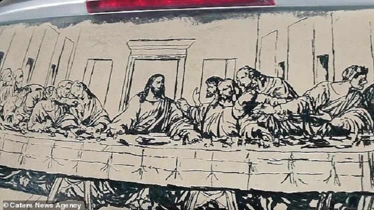 Either way, an artist named Dino Tomic from Notodden, Norway, seems to be going against the grain because the windshield of his beat-up Ford Mondeo is caked with a thick layer of dust. But just as we should make lemonade when there are lemons thrown at us, Dino decided to draw an intricate copy of The Last Supper using the dust on his windshield as a canvas.
