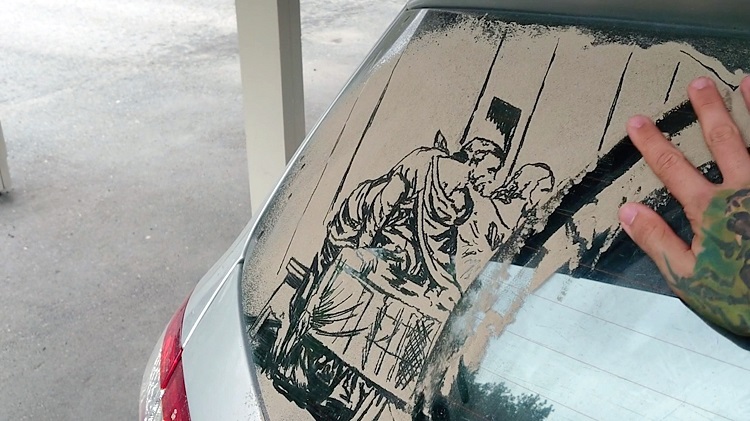 Watch what one artist drew on his car’s dusty windshield.