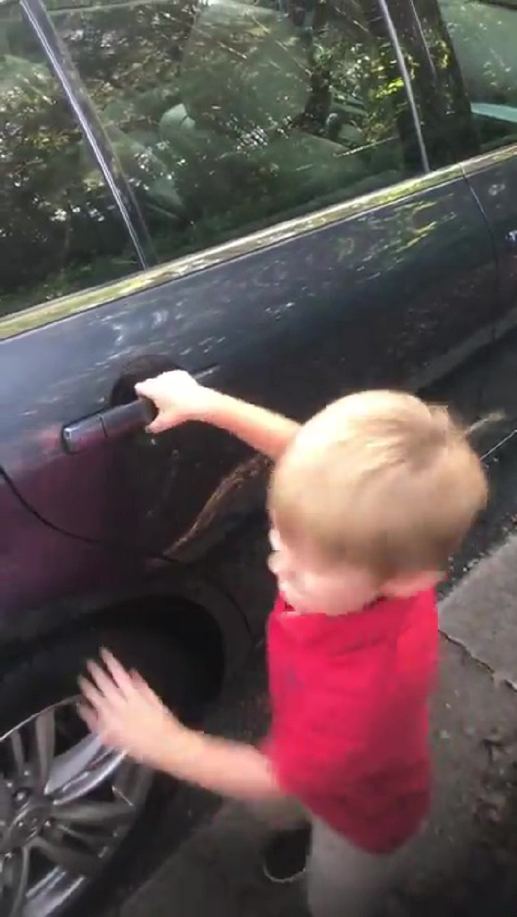 The video starts with little Hudson walking towards the car and the dad instructing him to open the door because there was a surprise waiting for him.