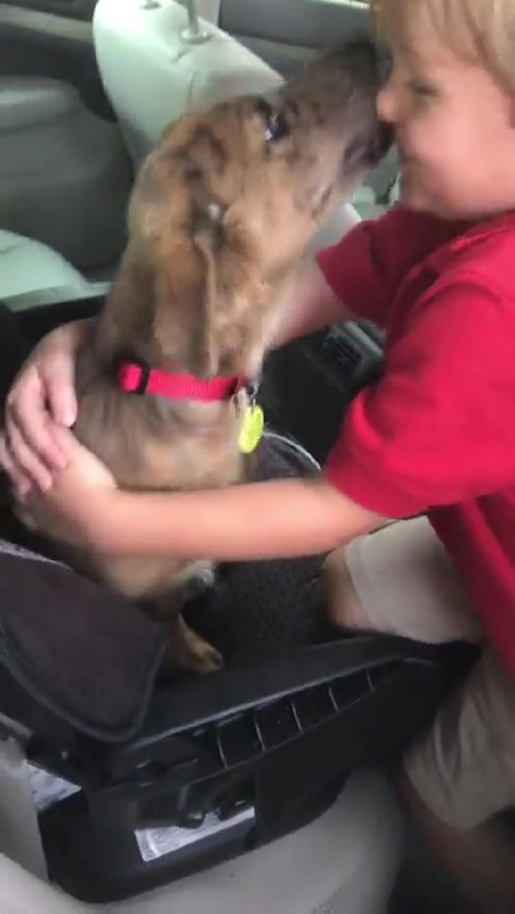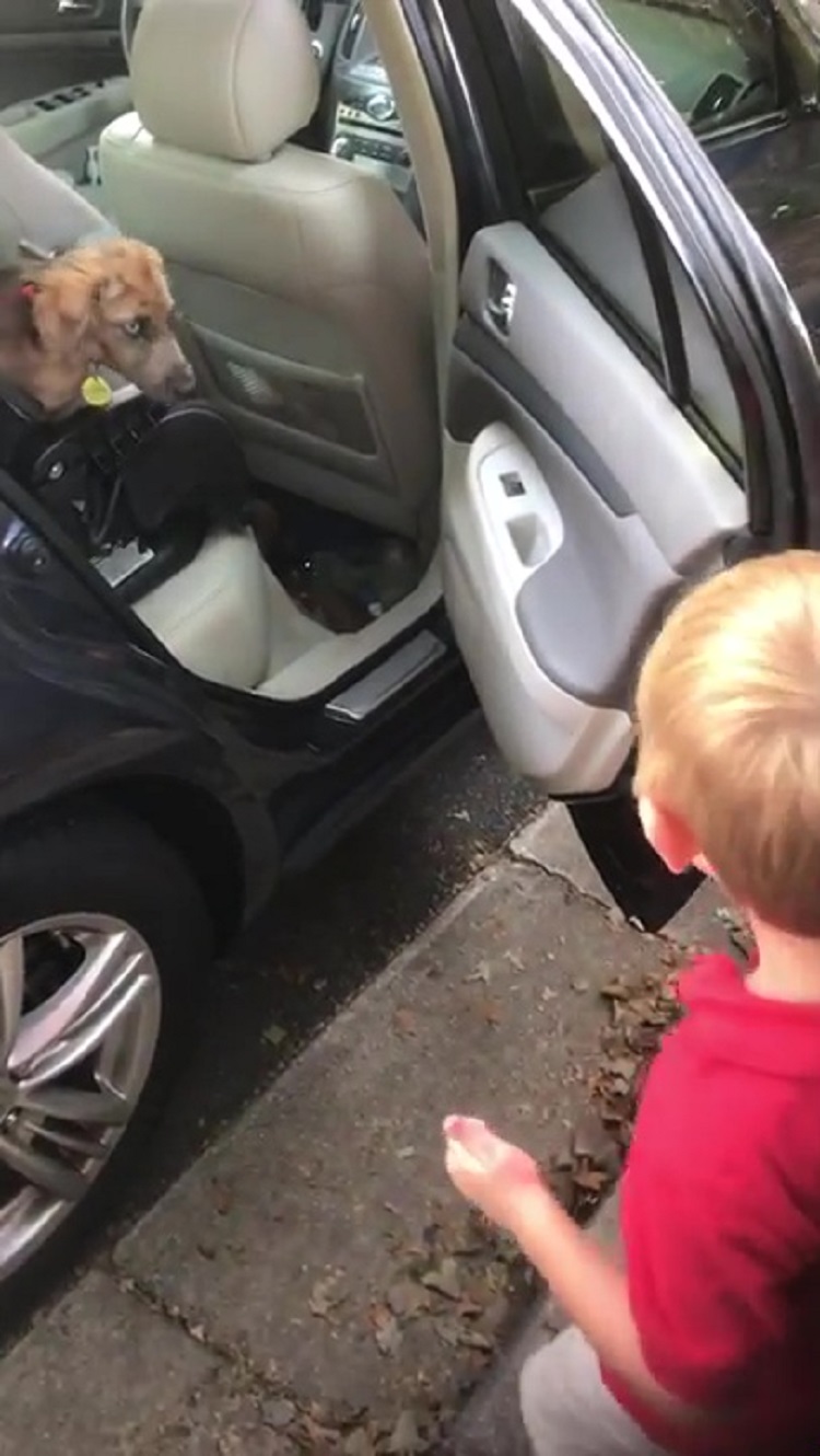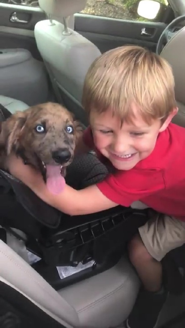 After a few tries with the stubborn door handle, Hudson excitedly opens the door and immediately comes face-to-face with a little pooch resting snugly on the car’s booster seat. At Hudson’s excited yelp, the puppy also sits up.
