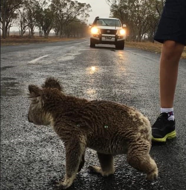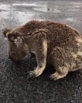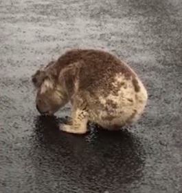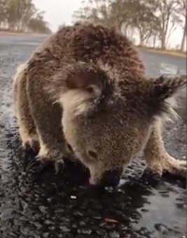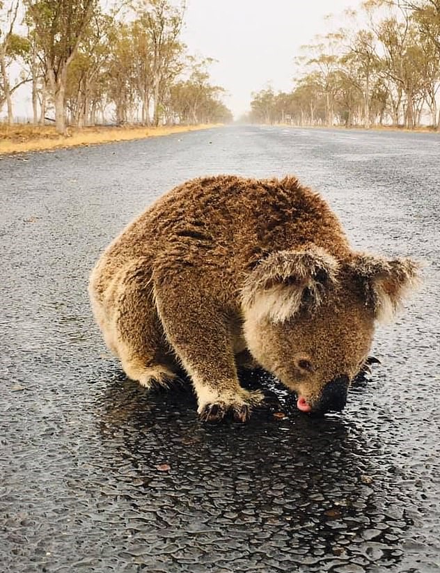 In a heartbreaking moment that was caught on camera, a thirsty koala is seen sipping rainwater off the road moments after rain bomb finally hit Australia.