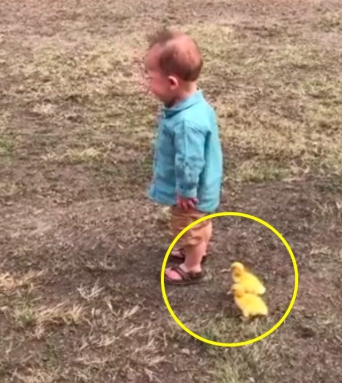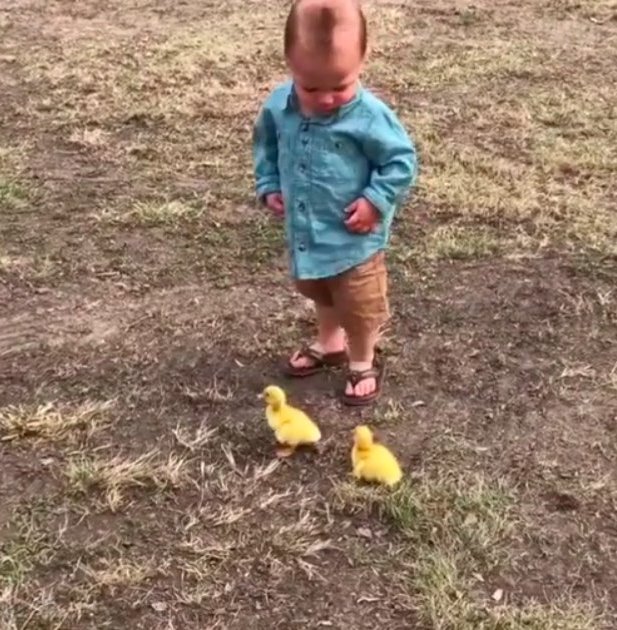 This little kid was standing in the middle of the field rubbing his nose when something collided with his legs, thinking that he might be in the path of these ducklings, he moved away.