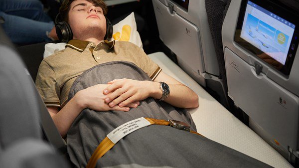 The new ‘Sleeper Seat’ transforms a row of three seats into a bed, which consists of a mattress, fitted sheet, head rest, pillow, blanket and amenity kit.