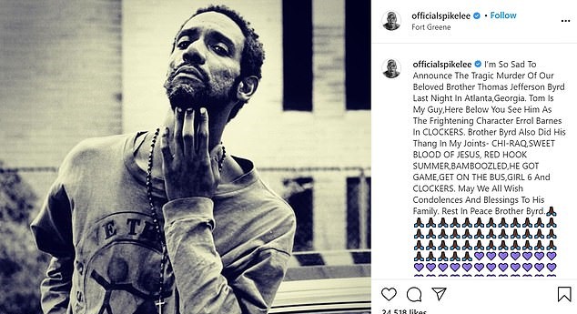 Lee wrote on Instagram: “I’m So Sad To Announce The Tragic Murder Of Our Beloved Brother Thomas Jefferson Byrd Last Night In Atlanta, Georgia. Tom Is My Guy, Here Below You See Him As The Frightening Character Errol Barnes In CLOCKERS.
