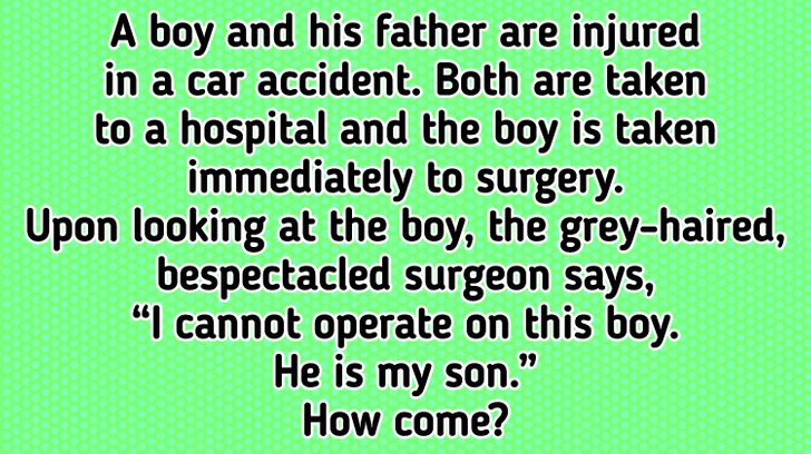 “A boy and his father are injured in a car accident. Both are taken to a hospital and the boy is taken immediately to surgery. Upon looking at the boy, the grey-haired, bespectacled surgeon says, ‘I cannot operate on this boy. He is my son.’ How come?”