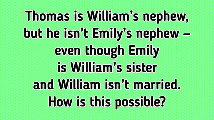 “Thomas is William’s nephew, but he isn’t Emily’s nephew – even though Emily is William’s sister and William isn’t married. How is this possible?”