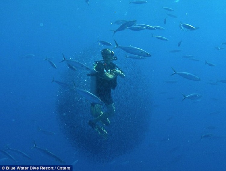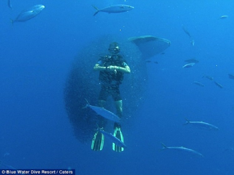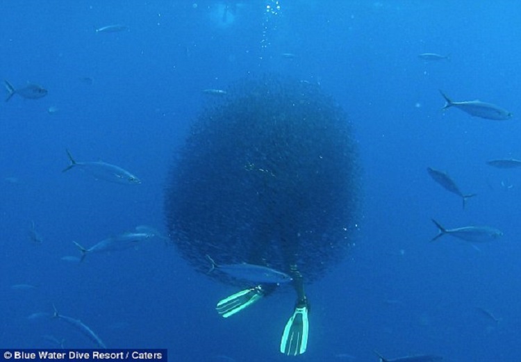 Divers normally swim into existing bait balls to take amazing photographs or conduct research but it’s quite rare for a bait ball to form around a diver.