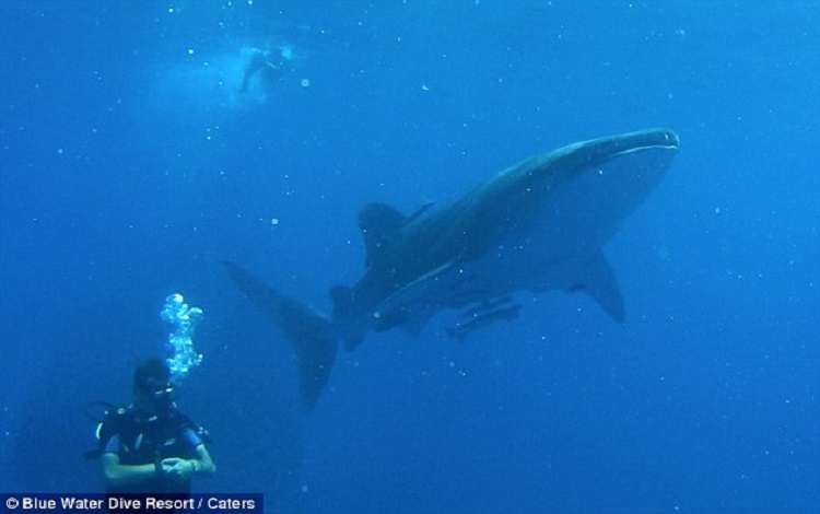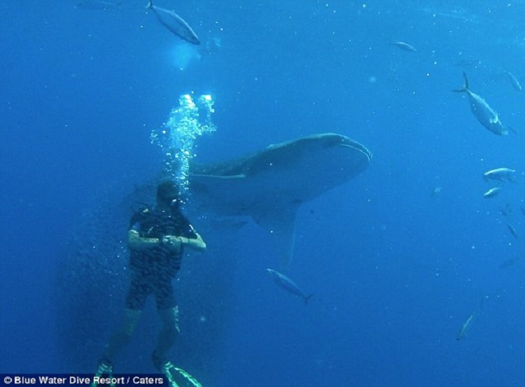 James, who manages the Blue Water Dive Resort, said: “The school of fish was seeking protection from the whale shark by being near the diver. We have seen this behavior before, but not when a diver is involved.