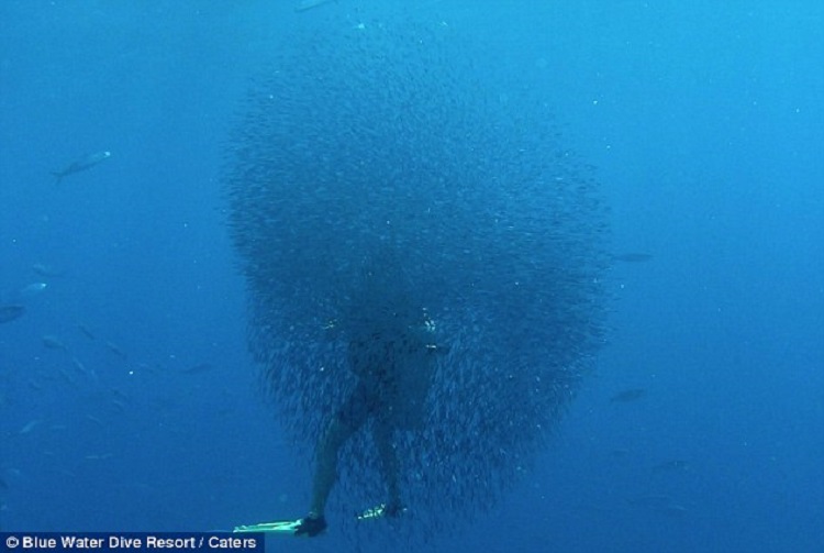 Tobias was suddenly engulfed by thousands of fish that formed a bait ball around him. A bait ball is a formation of tiny fish that groups around in a tight sphere around a common center.