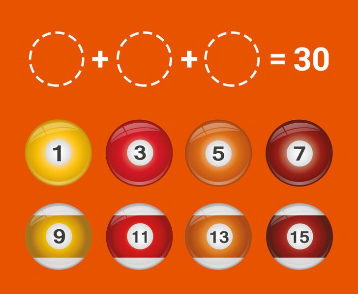 The photo shows eight balls but the puzzle requires you to combine only three balls to get 30. Which numbers should you combine?