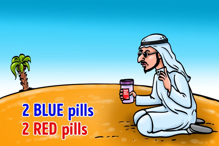 “A blind man gets marooned in a desert. He has 2 red pills and 2 blue pills with him. The pills are identical in size and shape. To stay alive, he must take 1 red pill and 1 blue pill.